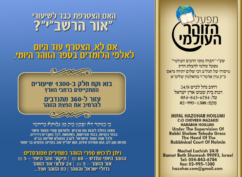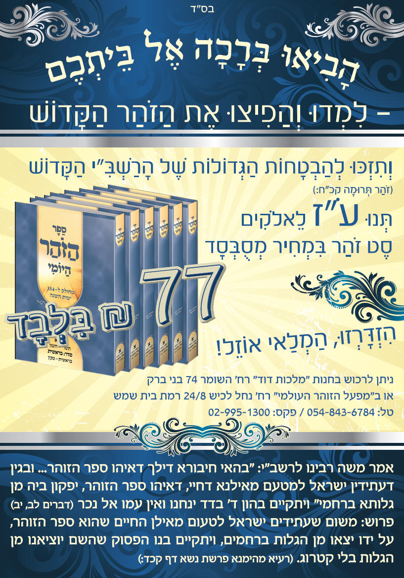 וכל המתנדבים מזכי הרבים שעוזרים להפצת הזוהר בארצינו הקדושה